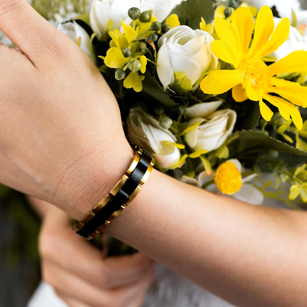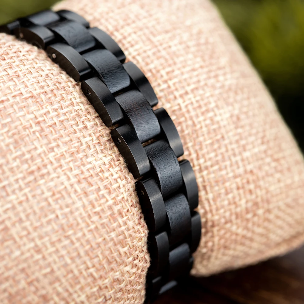 Ce bracelet en bois à maillons est fabriqué à partir de bois naturel et d'acier inoxydable.